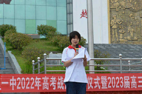 2023届学生代表2303班张锦辰同学也上台表达决心与态度。回顾两年来的学习生活,他感慨地说,来到一中,我们得到了老师最质朴、最深刻的关怀与教导。他满怀激情地说,从学长学姐手中接过接力棒,便怀壮志以长行,不负青春梦想,不负家长厚望,不负学校重托,不负社会期待。