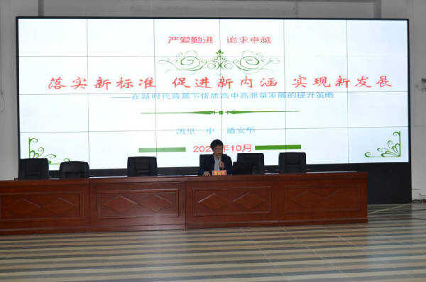 潘安华副校长做了“落实新标准•促进新内涵•实现新发展——在新时代背景下优质高中高质量发展的提升策略”的专题报告。结合明年迎接一类示范性高中复评准备工作,潘安华副校长特别分享了三点:一是学习与提升——学标准,二是实践与创新——用标准,三是思考与建议——用好标准。其中特别强调了两点:一是要重视复查中存在的问题,二是要清楚定位、做强本位。