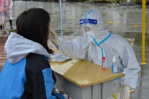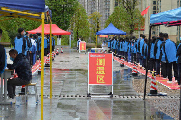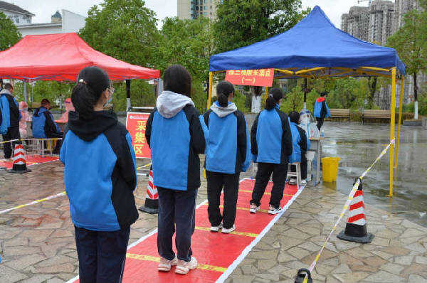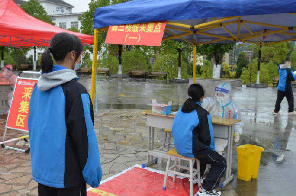 核酸检测安排在两个场地内设置的四个检测点进行。高二年级安排在新教学楼一侧的篮球场进行,高一高三年级和教职员工安排在铜鼓广场进行。学生分10人一组,依次进行人员信息采集和咽拭子采样,采样结束后进行标本封存、交接、转运、医疗废物处置、环境消杀等工作。